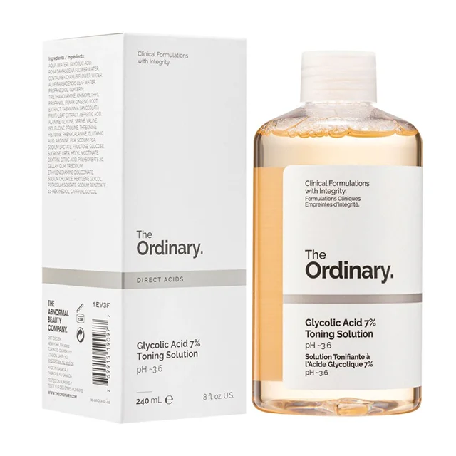 تونر گلیکولیک اسید 7% اوردینری لایه بردار و روشن کننده پوست تونر ها محصولاتی هستند که بعد از شستن صورت در روتین مراقبت از پوست، جهت تنظیم PH پوست و آماده سازی آن برای جذب بهتر سرم های مغذی استفاده می کنیم. تونر های لایه بردار و اسیدی علاوه بر رفع سلول های مرده و خارج کردن ناخالصی ها از منافذ پوست می توانند تاثیرات چشمگیری در کاهش مشکلات پوستی داشته باشند.تونر گلیکولیک اسید 7% اوردینری لایه بردار و روشن کننده پوست یکی از بهترین تونرهای لایه بردار باPH  تقریبا 3.6 است که سبب برگرداندن PH پوست به حالت طبیعی شده و همچنین پوست را آبرسانی و هیدراته می کند.